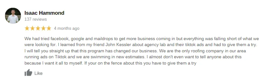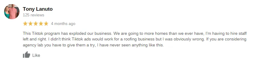 Tiktok right now is an open field, no competition, no other roofers running ads. Our average client is seeing 10 to 1 returns because appointments with roofing leads are so cheap, this won't last forever so now is the time to act.
